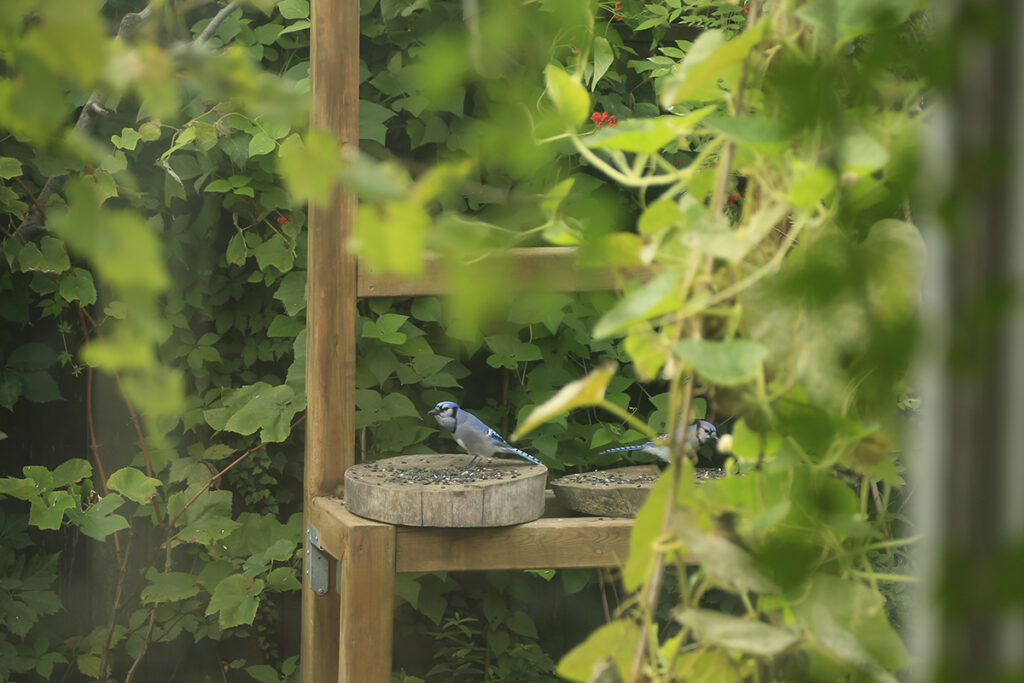 Surrounded by wisteria and bean vines, a pair of Blue Jays is enjoying their sunflower seed snack.